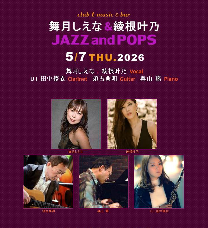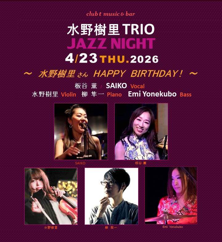 ~ ジュン と ナンシー の J-POP ~ 夏海ジュン・掃本南椎 (Vocal) Guest 水野樹里 (Violin) 渡辺かづき (Piano) 中林創造 (Bass) OPEN 18:30・CLOSE 23:30【空席有り】 STAGE 19:30 より 3 セット<入替えなし・23:00 終了予定> ☆【Seats Available】Please use the reservation form.